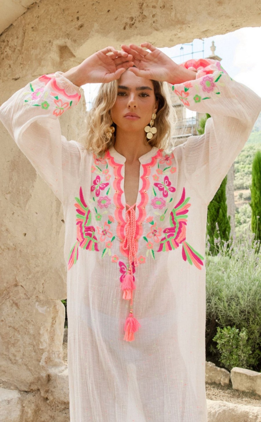Vestido Kagtán estilo Ibiza, confeccionado en tejido ligero y vaporoso de color crudo