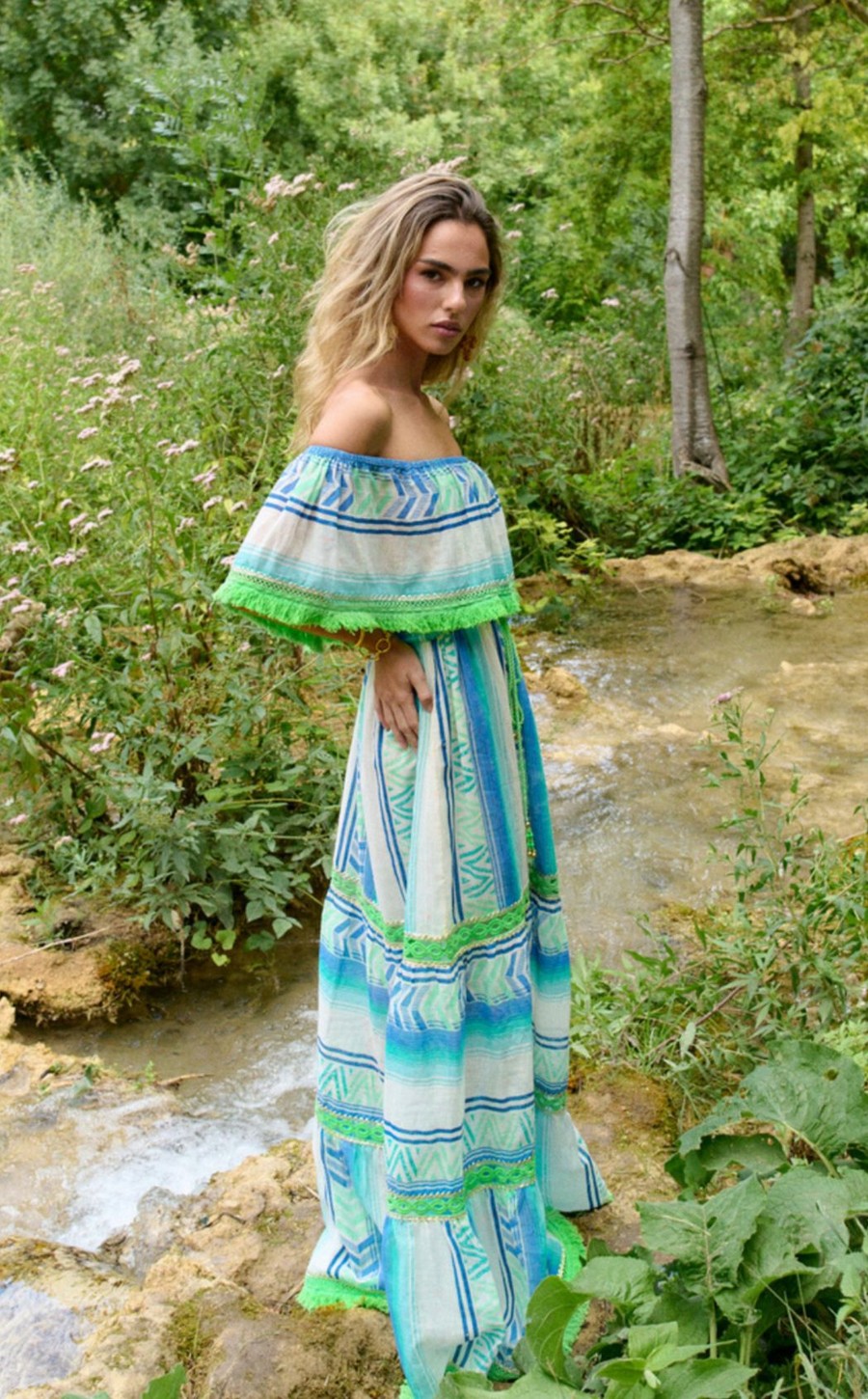 Vestido largo con rayas en tonos azules y verdes, diseño boho-chic con escote off-shoulder y detalles bordados en color lima.